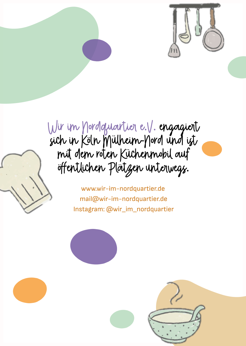 Für eine Grundschule in Köln-Mülheim habe ich ein Rezeptbuch gestaltet, das Kindern und Familien einfache, kostengünstige und gesunde Gerichte näherbringt. Initiiert vom Wir-im-Nordquartier e.V. und gefördert durch das Gesundheitsamt der Stadt Köln, war das Ziel, ein lokales, alltagstaugliches Produkt zu schaffen, das Freude am Kochen vermittelt und soziale Aspekte wie Erschwinglichkeit berücksichtigt.