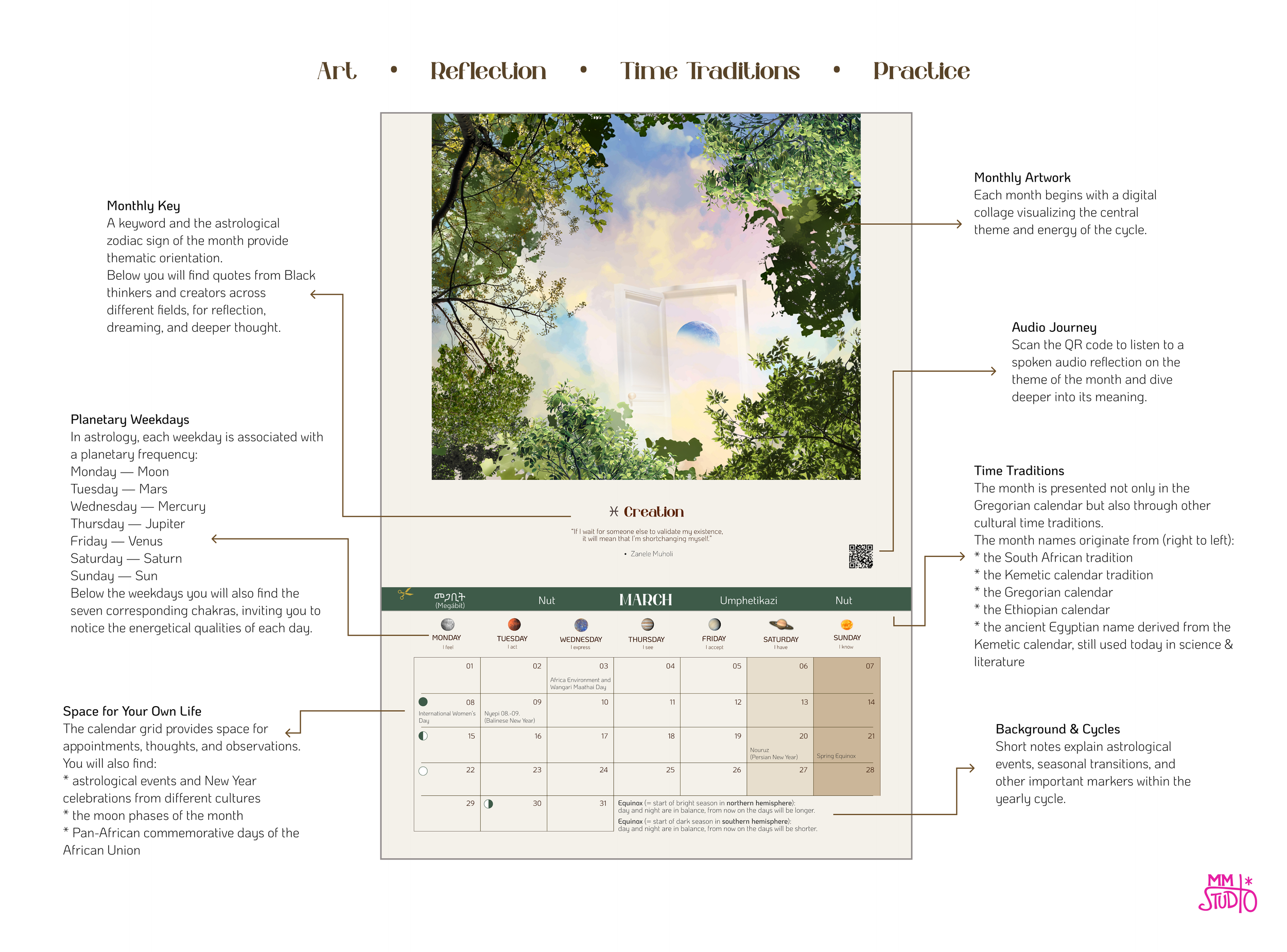 The calendar is rooted in African perspectives, yet intentionally conceived with a universal outlook.